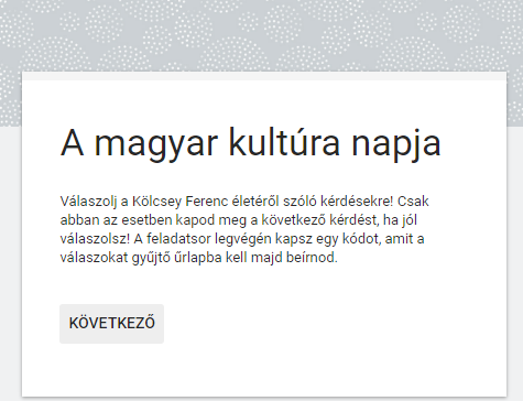 1. 5 kérdéses űrlap Kölcsey életéről – Kulcs: 7 betűből álló szó. Az űrlap a Google űrlapkészítőjével készült.