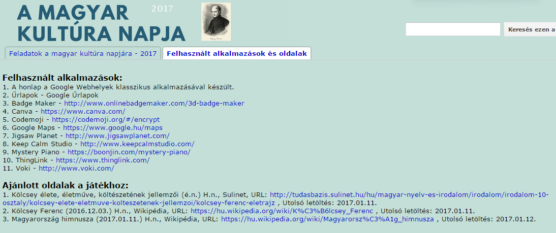 Az eredeti honlap már nem él (Google megszüntette a klasszikus webhelyeket), de az átdolgozott, friss anyag elérhető innen: A magyar kultúra napja 2024