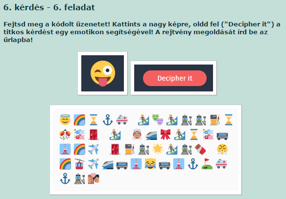 6. Kódfejtő feladat – egy titkos üzenethez jutunk el. Az eredetit dekódolással (“Decipher it!) tárhatjuk fel a megjelenített emotikon segítségével. A Codemoji alkalmazás megnyitásakor bal oldalon jelenik meg a kódolt üzenet, középen láthatók az emotikonok, amik közül ki kell választanunk a megfelelőt, jobbra pedig az eredeti üzenet fog előtűnni. Feladatunkban egy kérdés lesz látható. A feladat kódja a kérdésre adott válasz, egy dátum.