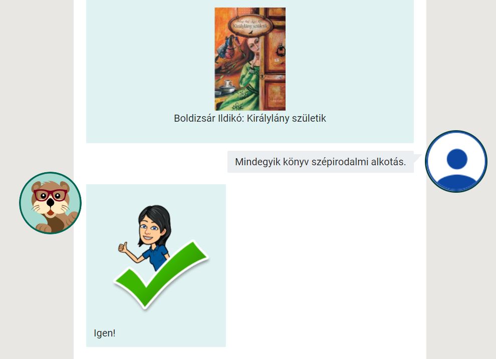 Rácz Tiborné tananyagát kis részekre bontottam, igyekeztem minden apró elemhez feladatot rendelni. Motivációként avatar matricákkal tűzdeltem tele az anyagot. Az avataromat a Bitmoji applikációval terveztem. A tematikus matricákat a program maga generálja, ezeket lementettem, majd az angol feliratosakat Photoshoppal magyarítottam.