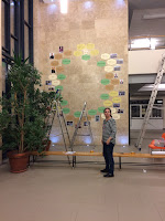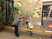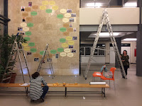 Ezután végre következhetett a megálmodott térkép felragasztása a falra. Ezt a hatalmas munkát Kriszti végezte, én csak a keze alá dolgoztam. A képeken látható, hogy milyen hatalmas teret kellett kitölteni, milyen magasban kellett dolgozni. Kriszti mókust meghazudtoló bátorsággal és lendülettel futkározott fel-le a képen is látható három, köztük egy irtózatosan magas létrán. Több mint négy órás megfeszített, nézőközönségtől sem mentes munka után a falon volt minden buborék! A kartonokat kétoldalú ragasztószalaggal erősítettük a falra. Néhány kolléga segített a ragasztó felapplikálásában, köszönet érte! Jó hangulatot teremtettek.