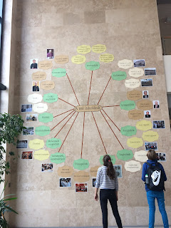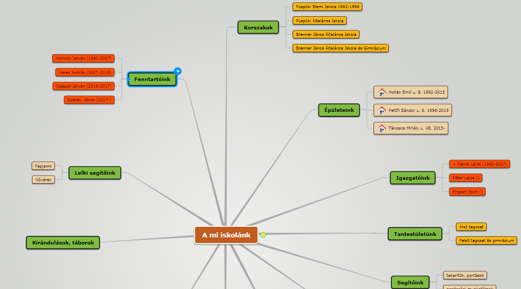 Az ötlet megvalósításához szabad kezet kaptam, de néhány nap után, késő este újabb ötlet villant fel bennem: talán jobb lenne egy hatalmas gondolattérképet alkotni az aula hatalmas, üres falára! Azon nyomban, lehetett talán éjfél is, előkaptam a tabletemet, megkerestem a Mindomo alkalmazást, s 15-20 perc alatt fel is vázoltam “A mi iskolánkat”. Szinte megálmodtam a térképet.