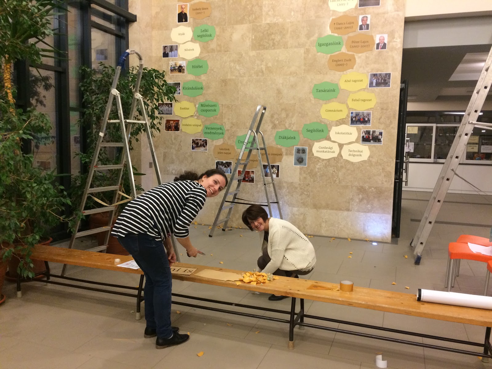 A jubileumi előkészületeket szeptember elején kezdtük meg. Nem sok töprengés után egy divatos idővonal megalkotása ötlött fel bennem, melyet az aula kápolna melletti részére képzeltem el. Az egyes állomásokhoz (időpontokhoz) csak címszavakat és 1-1 képet terveztem. De, hogy érdekes legyen az idővonal, és sok képet lehessen nézegetni, QR-kódokon keresztül elérhető fotógaléria létrehozását gondoltam el.