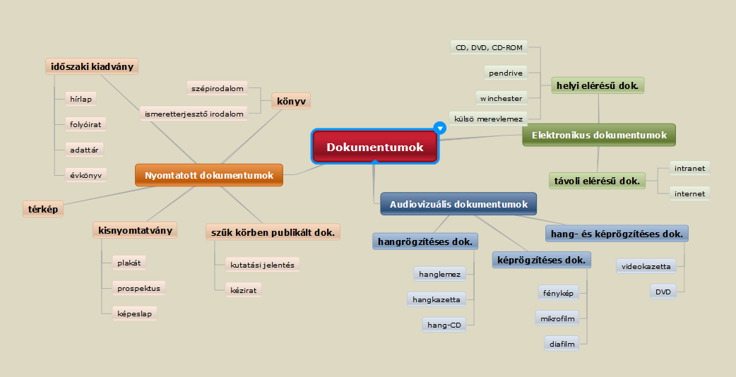 Leggyakrabban a Mindomo alkalmazást használom. Legutóbb a dokumentumismeret tanításához készítettem egy gondolattérképet. A képen “barangolva” összecsukhatjuk és kinyithajuk az elágazásokat, attól függően, hogy milyen mélységben kívánjuk szemléltetni a vizsgált fogalmat.