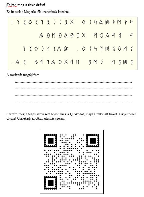 “Üdvözlünk Benneteket! A Magor bolygóról érkeztünk. Őseinket 1000 évvel ezelőtt rabolták el a világ legcsodálatosabb helyéről, amit ma Magyarországnak neveznek. Áttelepítették őket a Magorra. Mi vagyunk a leszármazottaik.Mindent tudunk Rólatok! Szeretnénk Veletek kapcsolatba lépni, megismerni Titeket, de nagyon félénkek vagyunk. Ezért elrejtőztünk a magyar történelem jeles helyszínein. Úgy találhattok meg minket, ha játszotok velünk, azaz a rejtekhelyeinken megoldjátok a Rátok váró feladatokat. Ha sikerül, akkor méltók vagytok arra, hogy megismerjetek minket. Ha megértettétek ezt az üzenetet, akkor menjetek vissza az űrhajónkra, ott találtok egy különleges hengert, ami a rejtőzködésünk helyszíneit tartalmazza.”