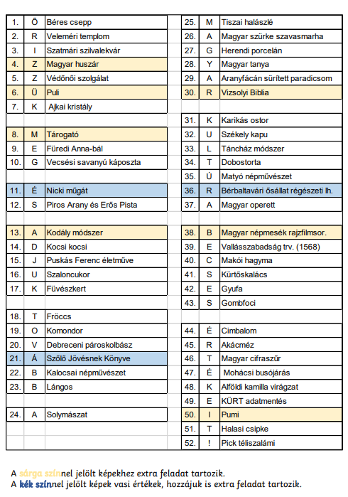 - jellegzetes magyar tárgyakkal, ételekkel, értékekkel.