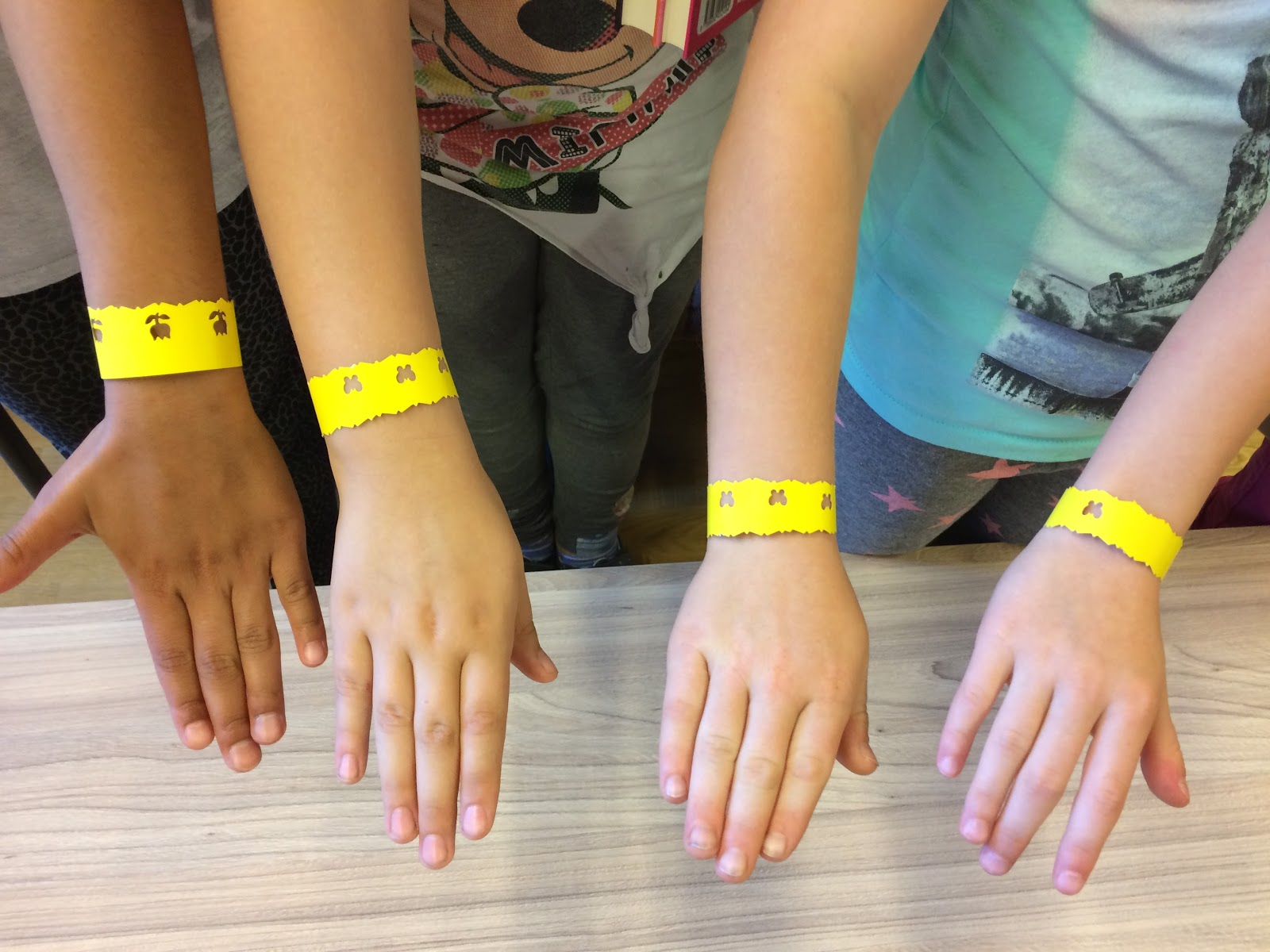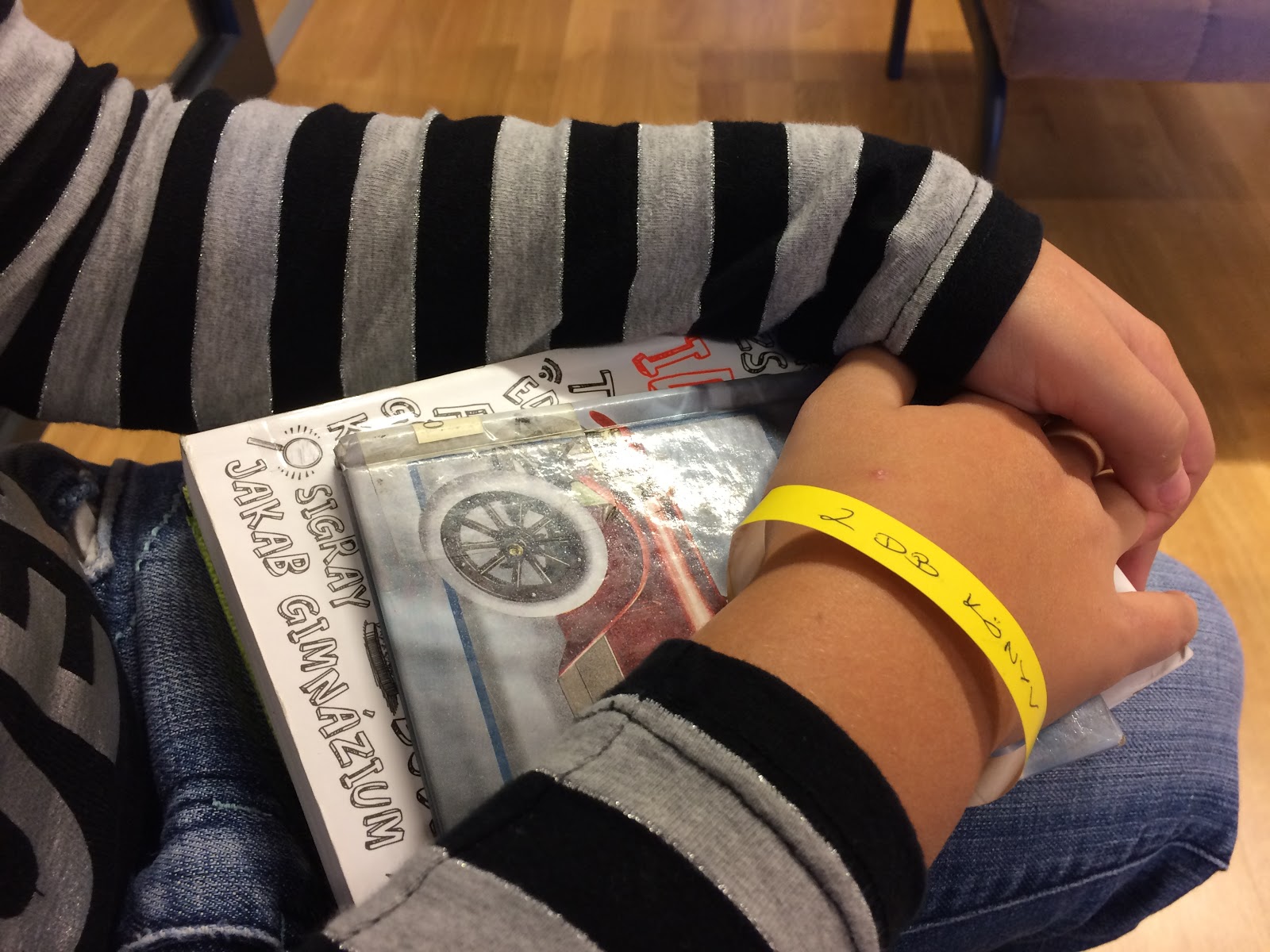 Így gyors méretvétel és vagdosás után a szalagra ráírtam, hogy hány könyvet kell másnap visszahozniuk, majd felcsatoltuk a karkötőket.