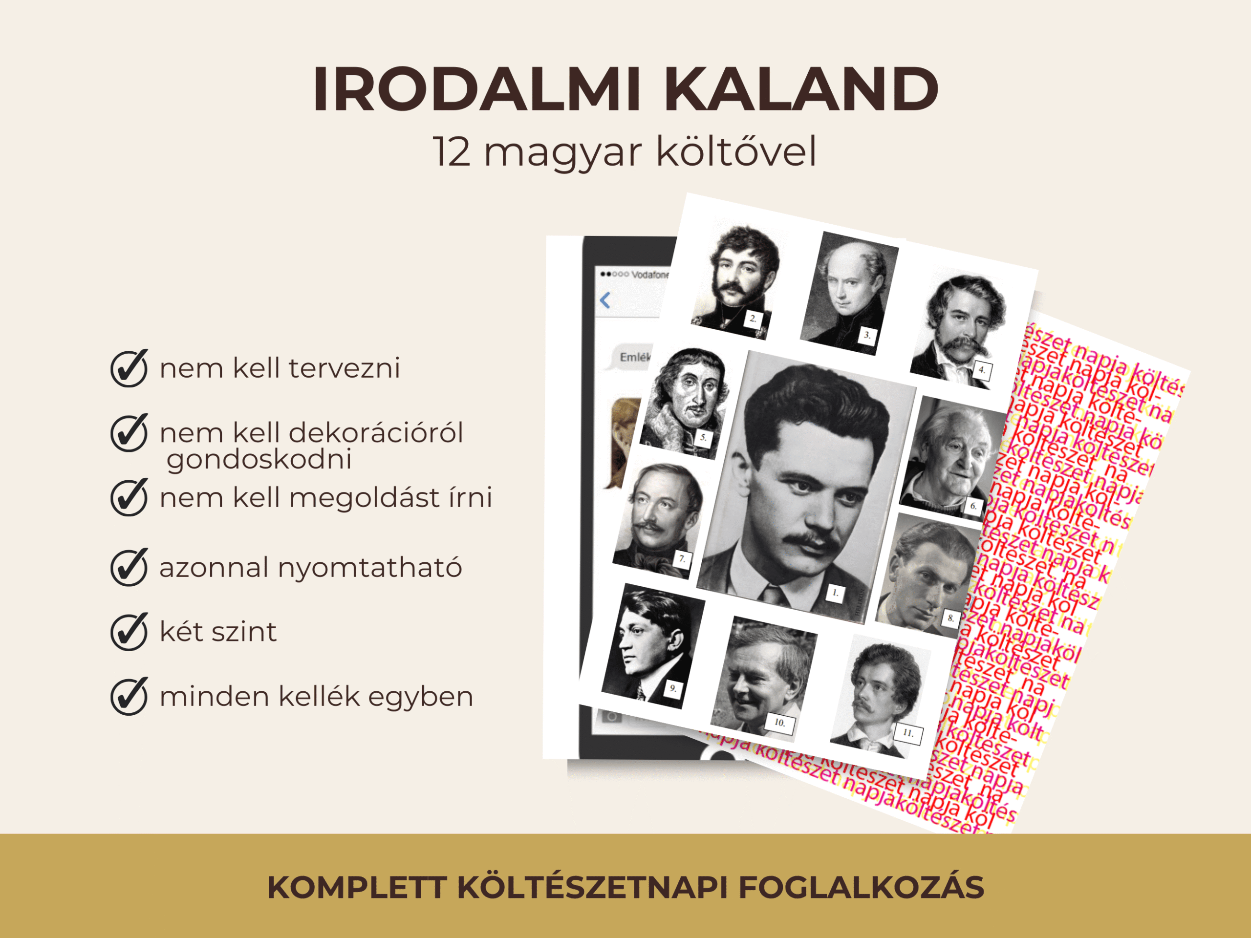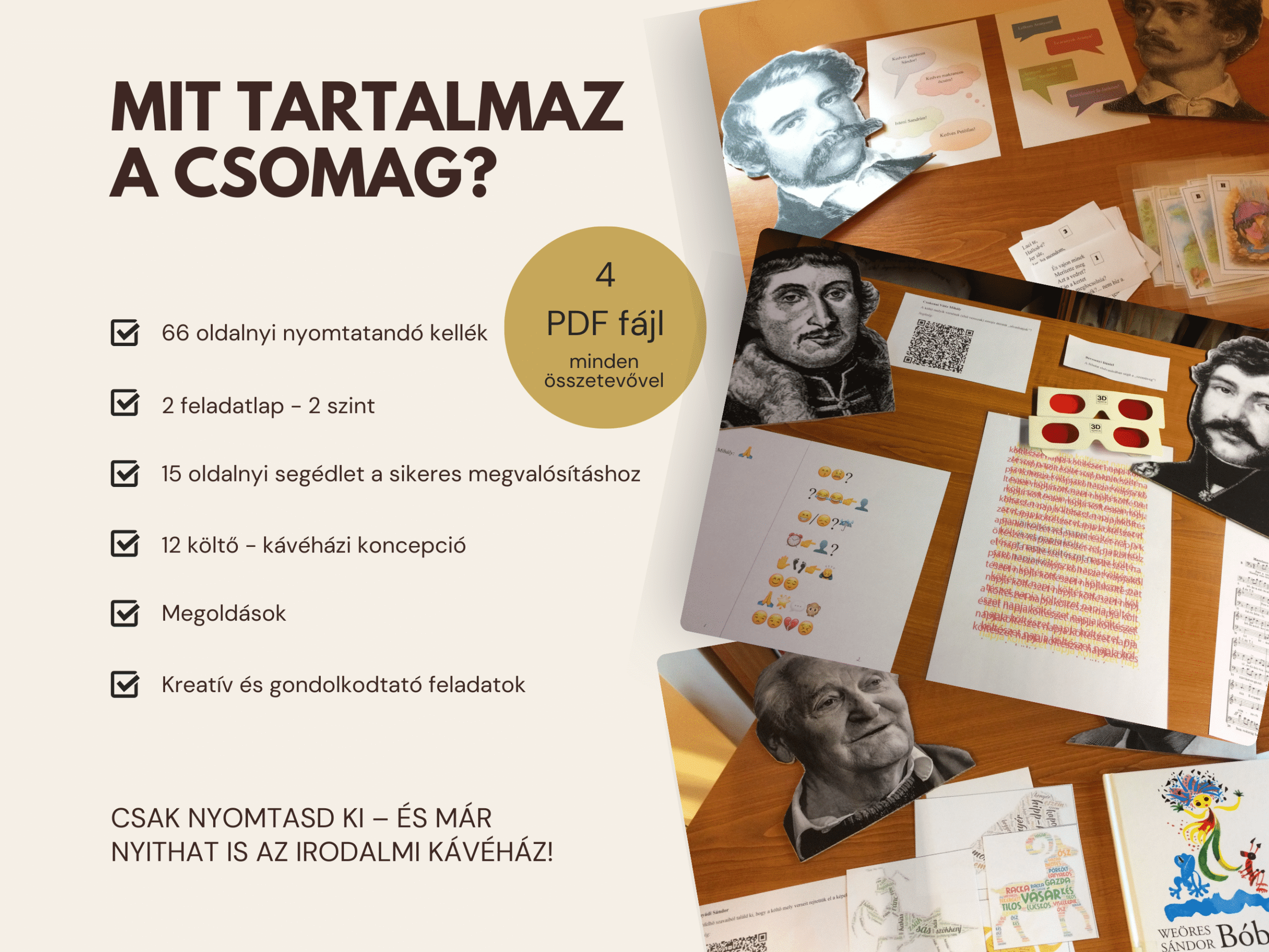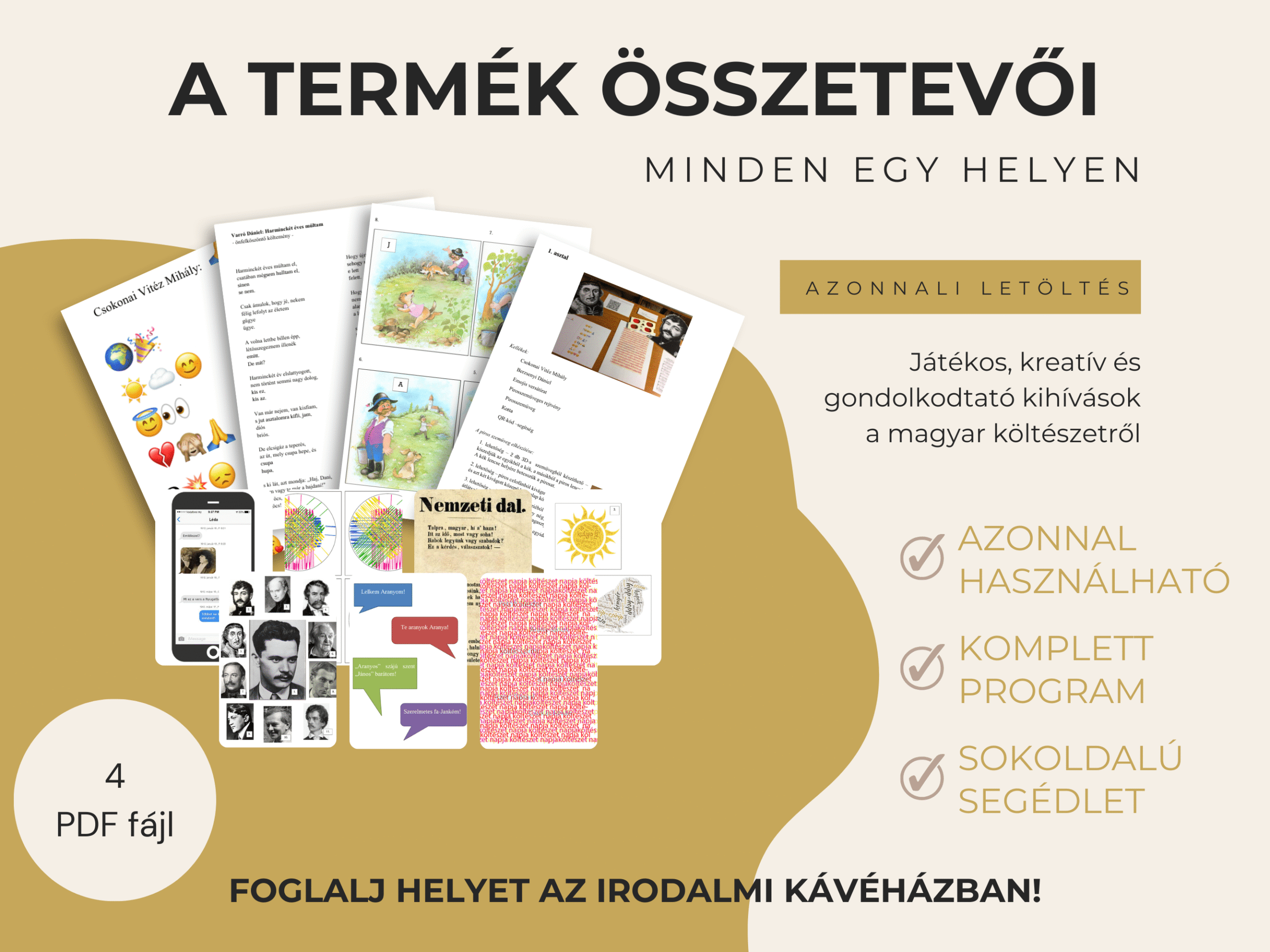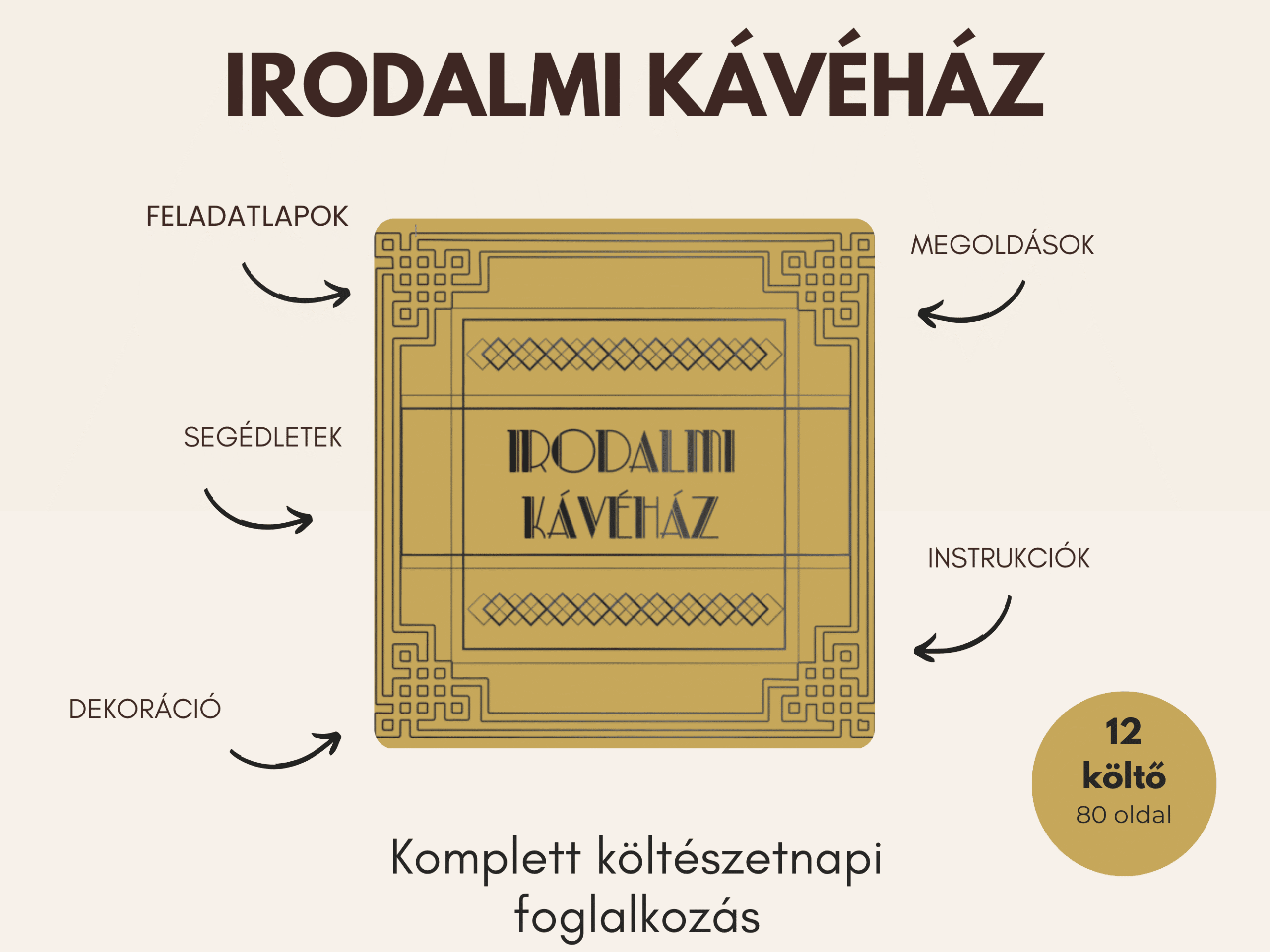 Lépj be az Irodalmi kávéházba, ahol 12 magyar költő várja a diákokat játékos feladatokkal a költészet napja alkalmából. ☕📚 A 80 oldalas csomag komplett programot kínál feladatokkal, megoldásokkal, tanácsokkal és nyomtatható dekorációval.