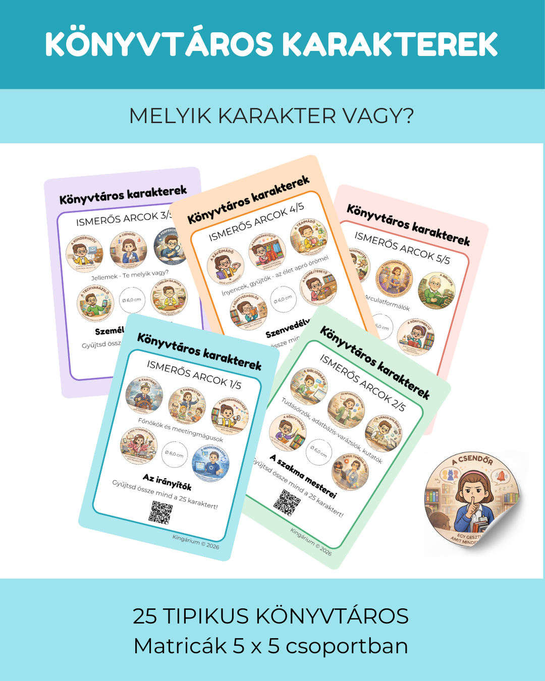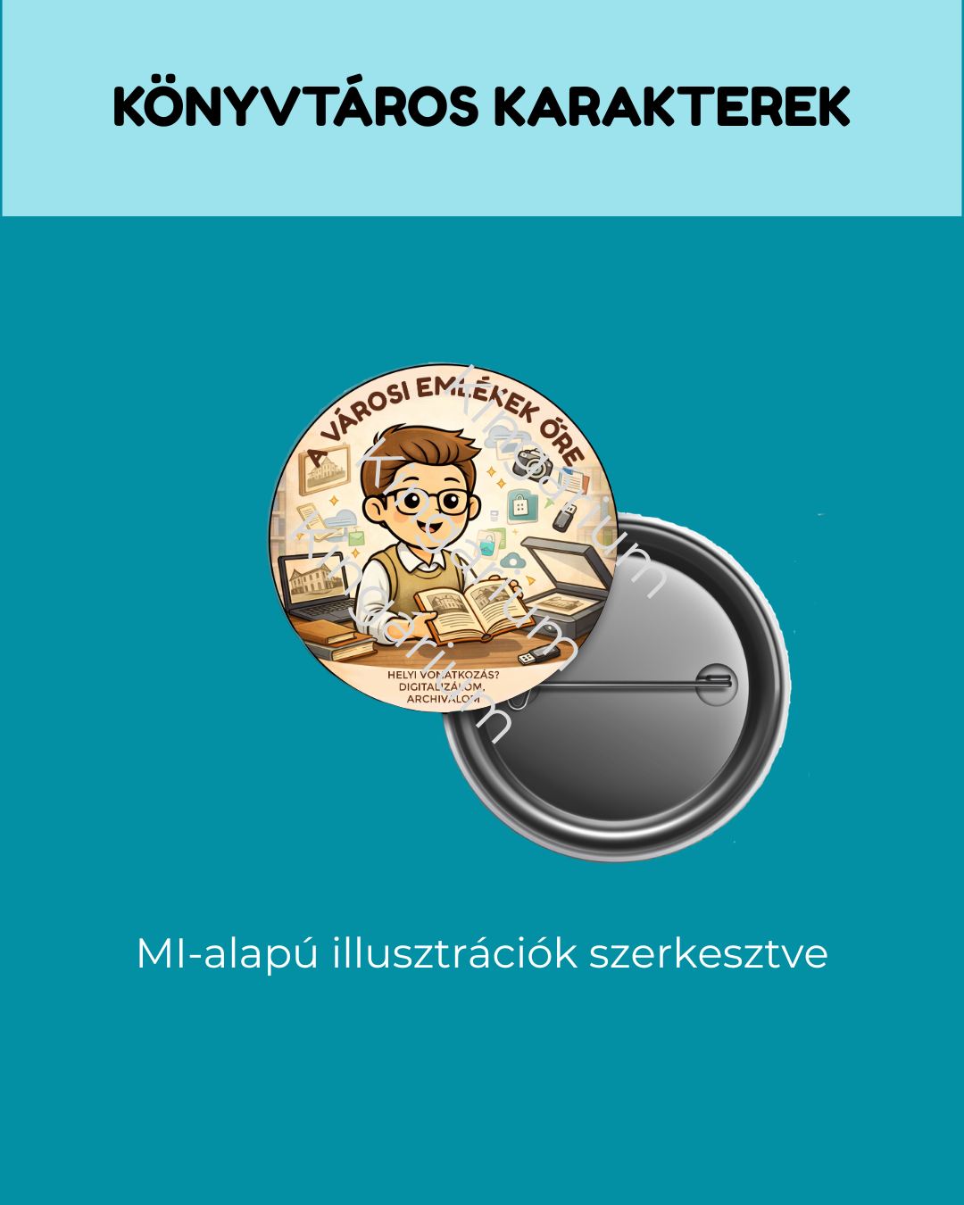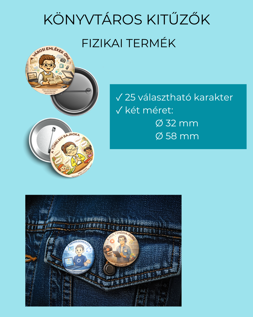 A kitűzőkön egy-egy könyvtáros típus jelenik meg, 25 karakter két választható méretben: 32 mm és 58 mm átmérőjű kör alakú grafikán.