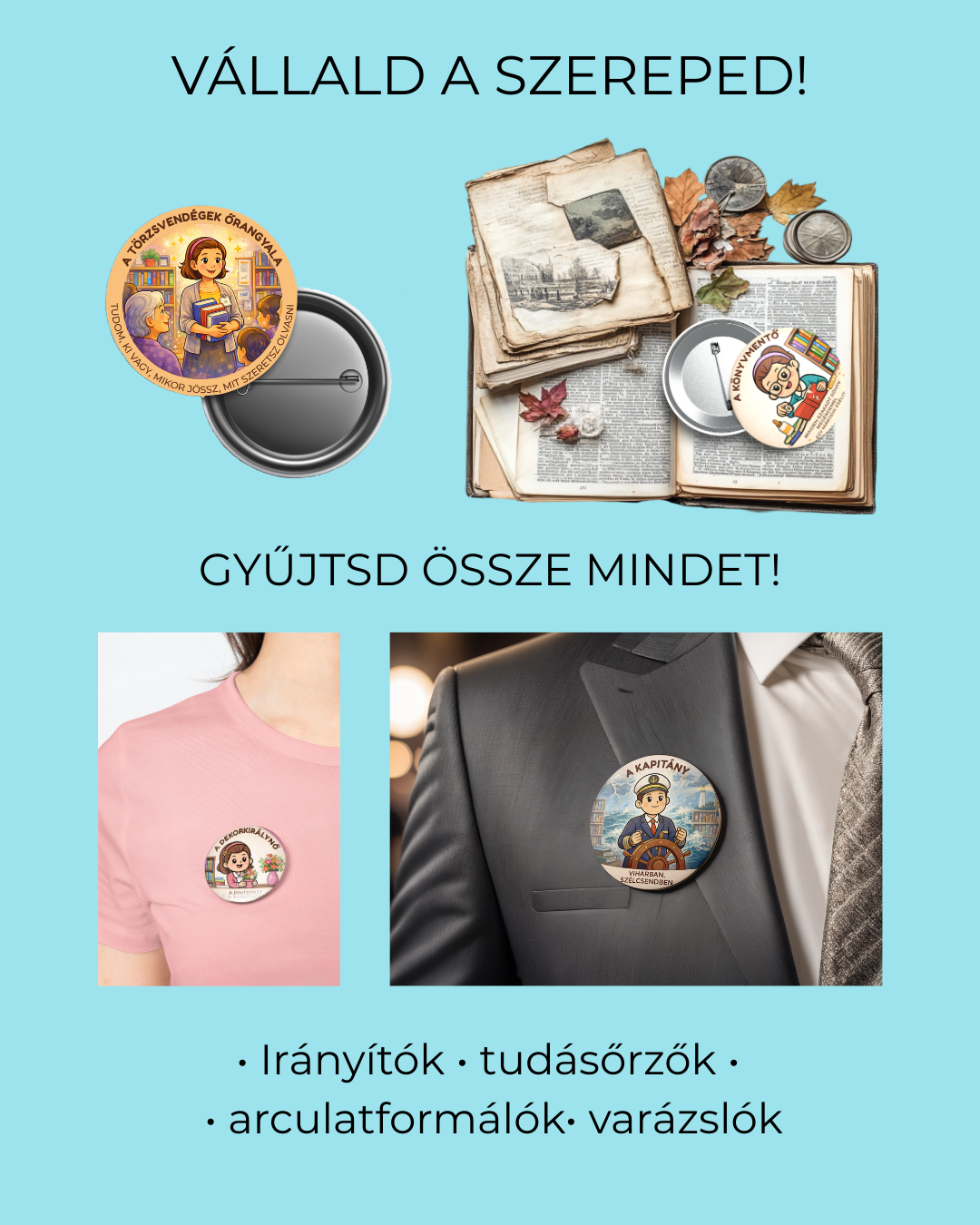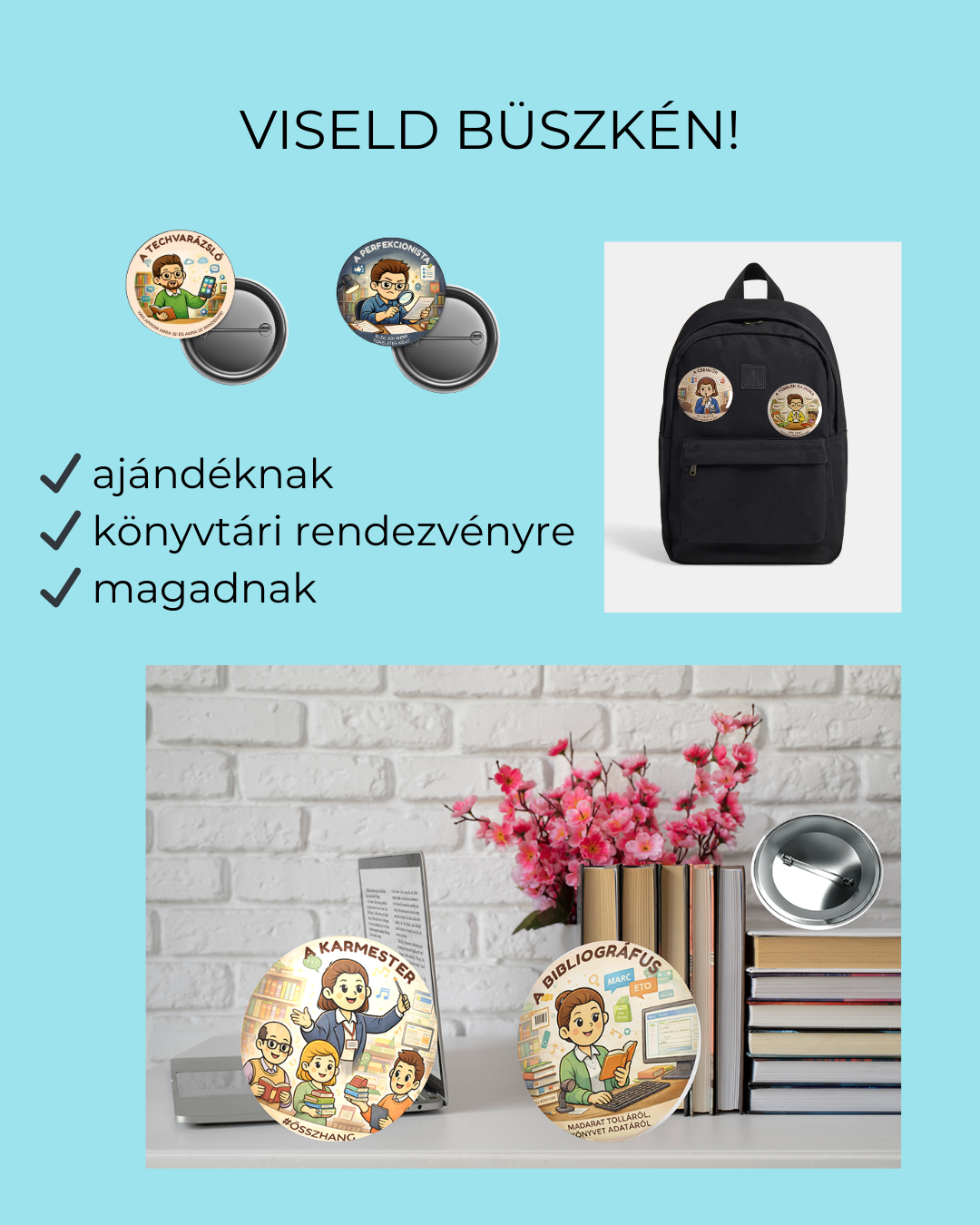 Ezek a kitűzők olyan kiegészítők, amik megmutatják, ki milyen „könyvtári szuperképességgel” rendelkezik. Táskára, kabátra, tolltartóra tűzve erősítik a könyvtáros közösséghez tartozást.